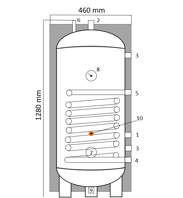 Desen orientativ – Boiler 130l cu 1 serpentina, iesiri în dreapta, montaj pe podea
