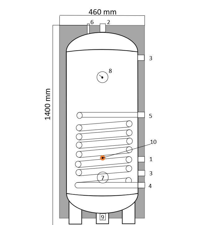 Desen orientativ – Boiler 150l cu 1 serpentina, iesiri în dreapta, montaj pe podea
