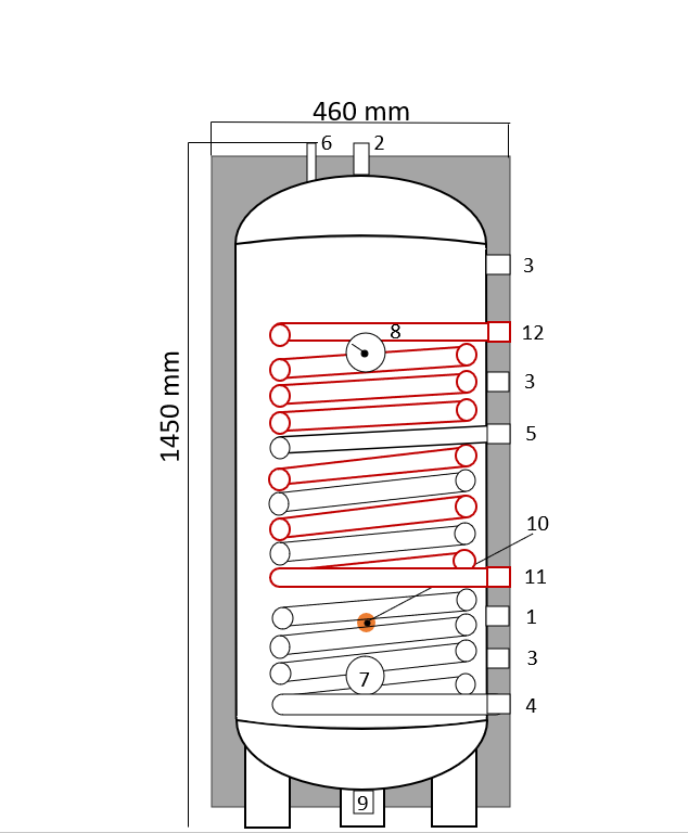 Desen orientativ – Boiler 150l cu 2 serpentine, iesiri în dreapta, montaj pe podea